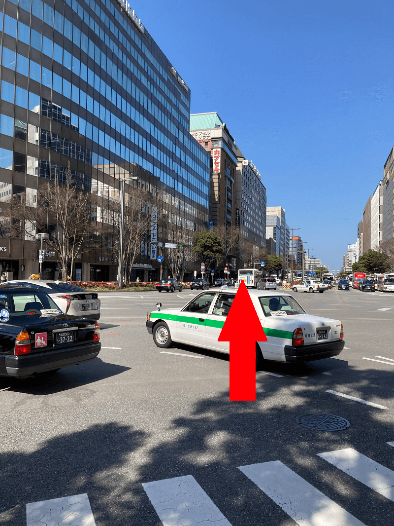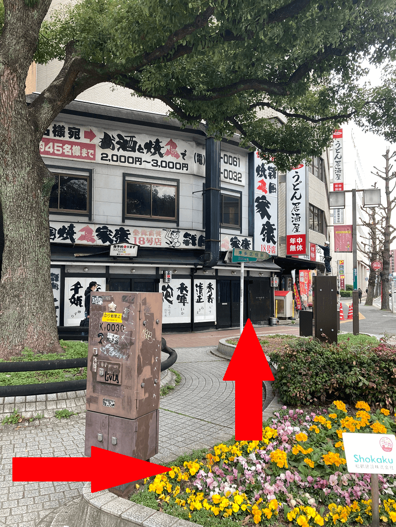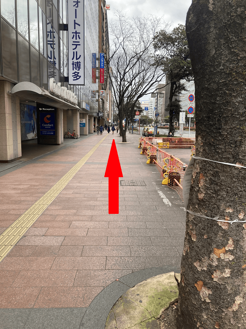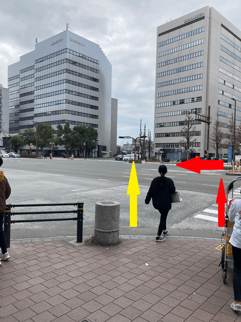 ①博多バスターミナルから道路を反対側にわたります。