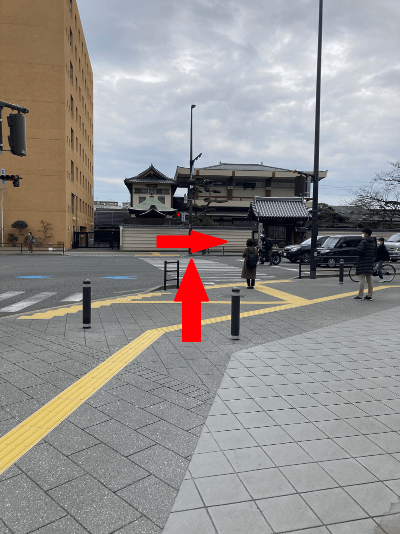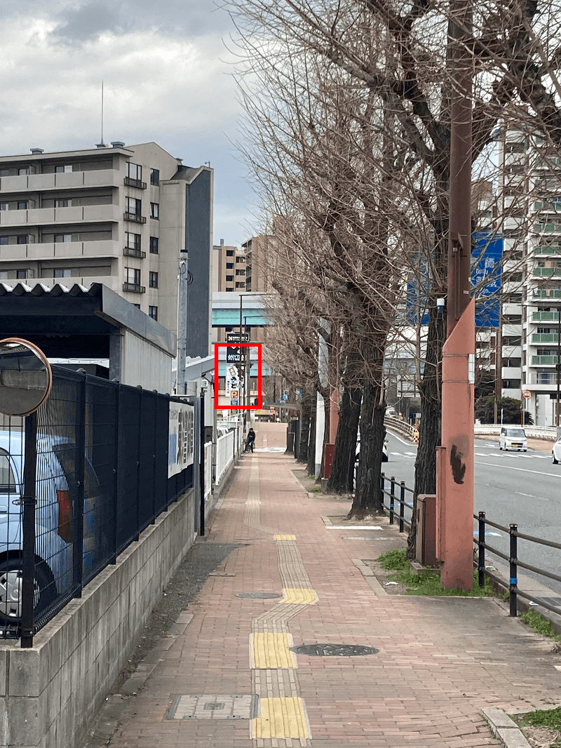 ①戦国焼き鳥家康18号店(焼き鳥屋さん)を背にして横断歩道を1回、道路沿いにもう1回わたります。